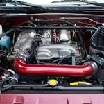 A maroon-red colored vehicle with the hood latch open. The engine contains a new open air intake component.